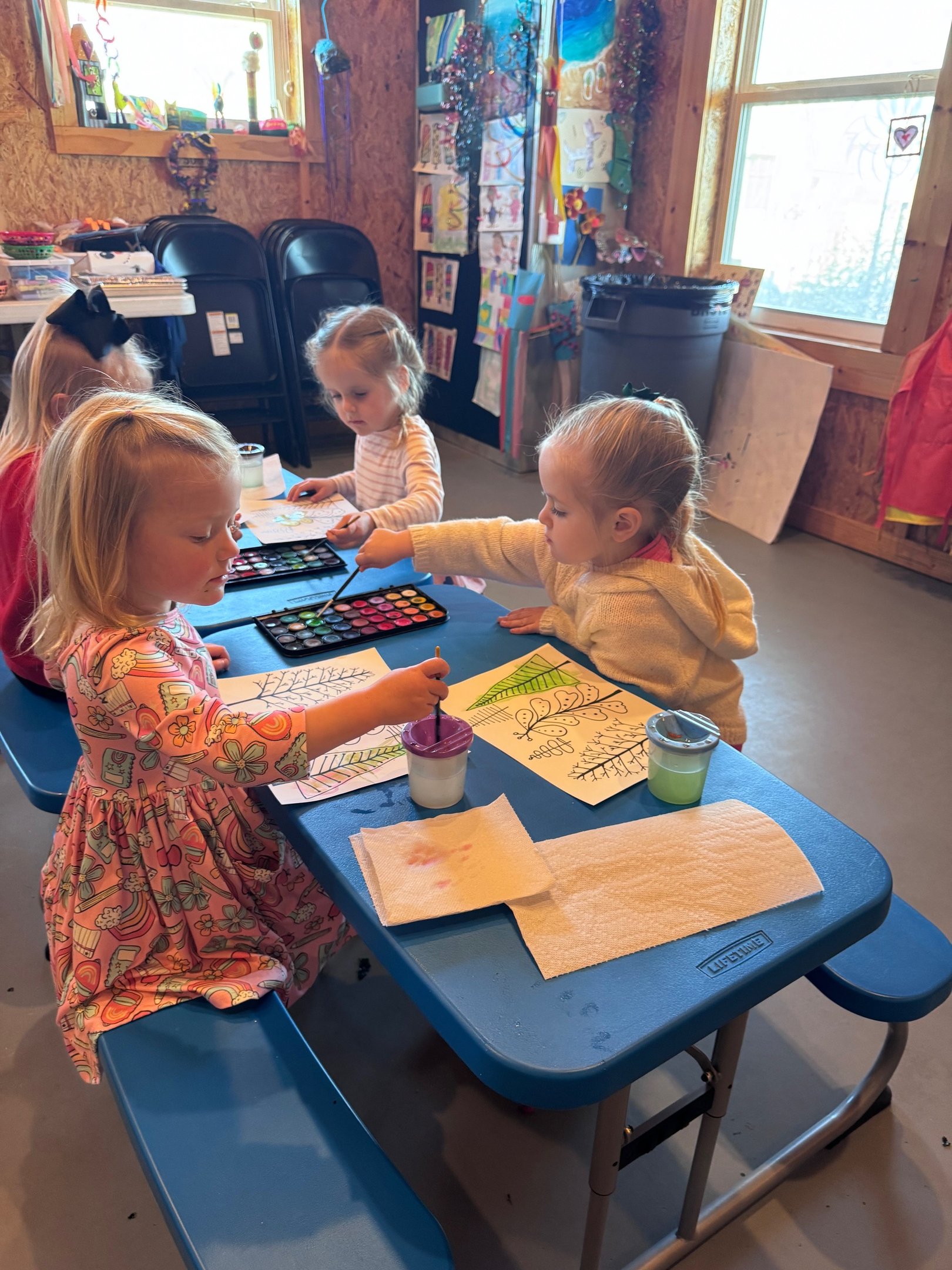 One day art classes for potty independent 3 year olds - 6 year olds. Classes are 2.5 hours long and are individual day sign up. Each class offers mixed media projects (paint, watercolor, pastels, cutting, gluing, etc.) Artistic fun that incorporates holidays, seasons, books, math, and science.